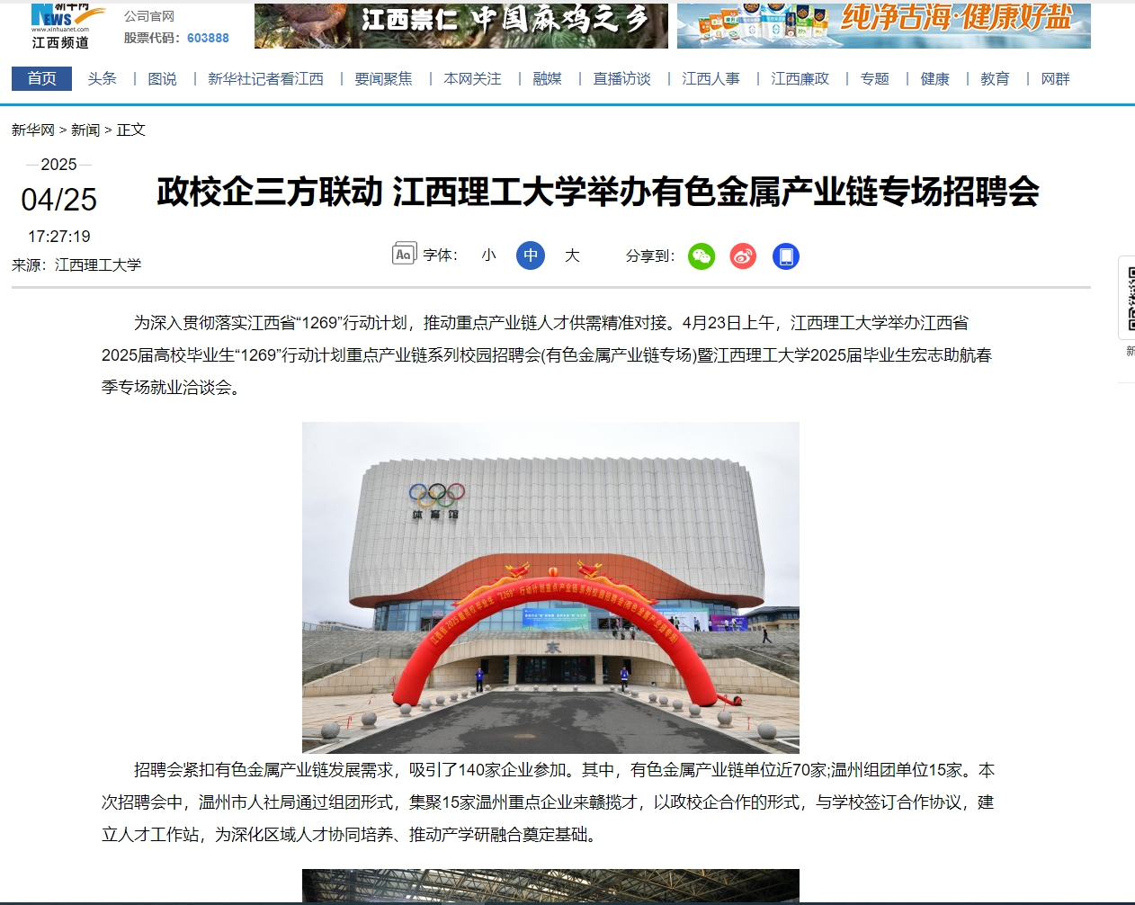 为深入贯彻落实江西省“1269”行动计划,推动重点产业链人才供需精准对接。4月23日上午,江西理工大学举办江西省2025届高校毕业生“1269”行动计划重点产业链系列校园招聘会(有色金属产业链专场)暨江西理工大学2025届毕业生宏志助航春季专场就业洽谈会。