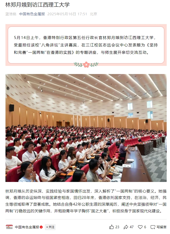 5月14日上午,香港特别行政区第五任行政长官林郑月娥到访江西理工大学,受邀担任该校“八角讲坛”主讲嘉宾,在三江校区志远会议中心发表题为《坚持和完善“一国两制”在香港的实践》的专题讲座,与师生展开亲切交流互动。
