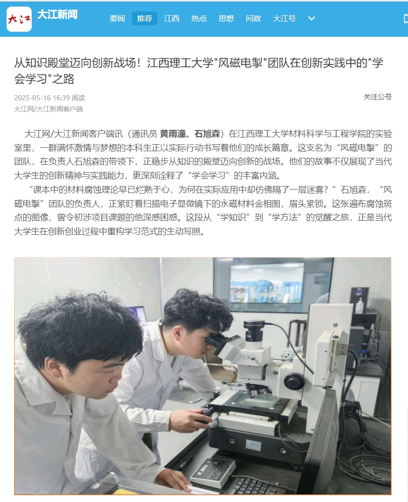 大江网/大江新闻客户端讯(通讯员黄雨潼、石旭森)在江西理工大学材料科学与工程学院的实验室里,一群满怀激情与梦想的本科生正以实际行动书写着他们的成长篇章。这支名为“风磁电掣”的团队,在负责人石旭森的带领下,正稳步从知识的殿堂迈向创新的战场。他们的故事不仅展现了当代大学生的创新精神与实践能力,更深刻诠释了“学会学习”的丰富内涵。