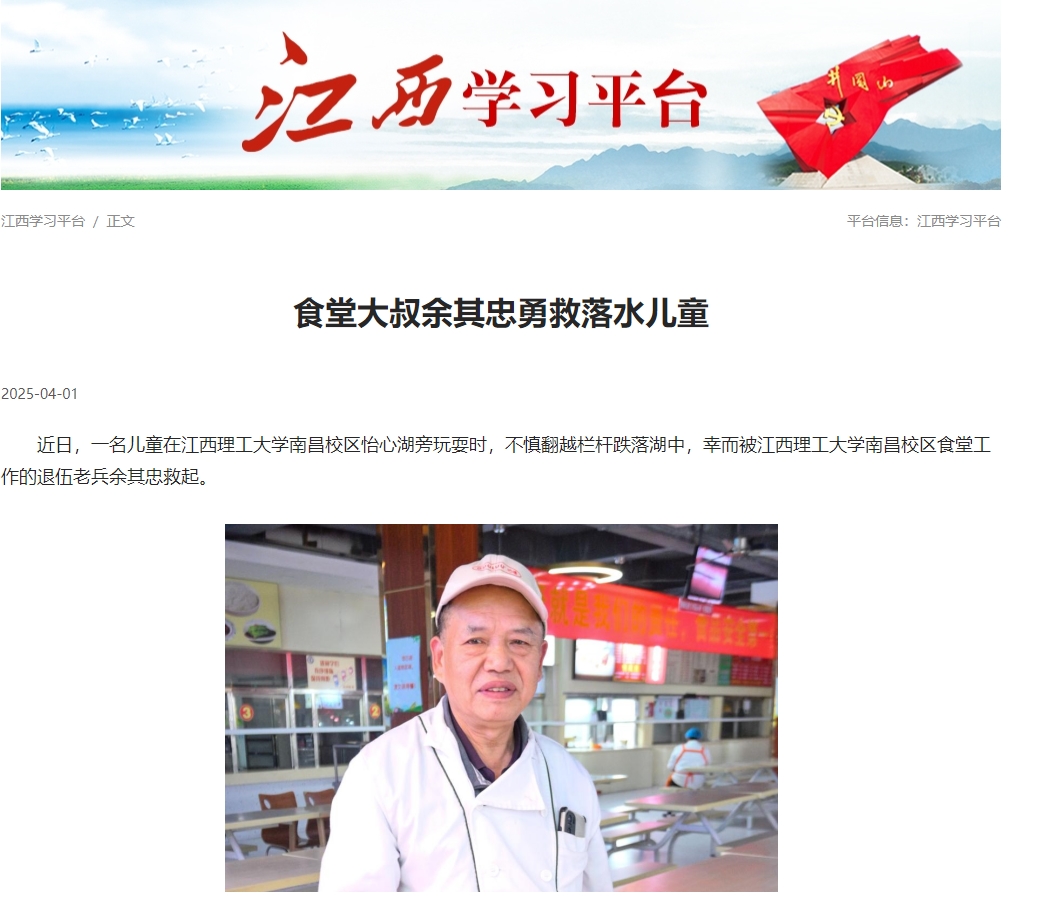 近日,一名儿童在江西理工大学南昌校区怡心湖旁玩耍时,不慎翻越栏杆跌落湖中,幸而被江西理工大学南昌校区食堂工作的退伍老兵余其忠救起。
