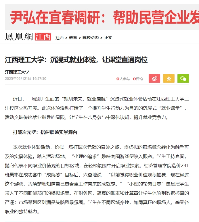 近日,一场别开生面的“规划未来,就业启航”沉浸式就业体验活动在江西理工大学三江校区火热开展。此次体验活动打造了一个提升学生行动力为目的的沉浸式“就业课堂”,活动突破传统就业指导的局限,让学生在亲身参与中深化认知,提升就业竞争力。