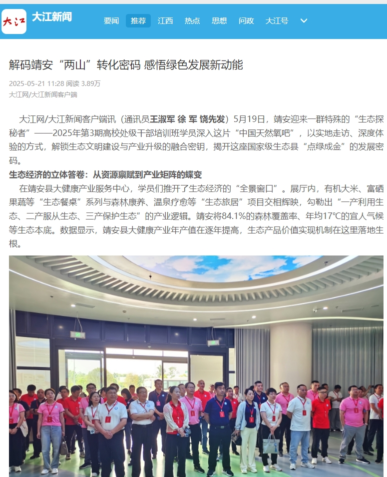 大江网/大江新闻客户端讯(通讯员王淑军 徐 军 饶先发)5月19日,靖安迎来一群特殊的“生态探秘者”——2025年第3期高校处级干部培训班学员深入这片“中国天然氧吧”,以实地走访、深度体验的方式,解锁生态文明建设与产业升级的融合密钥,揭开这座国家级生态县“点绿成金”的发展密码。