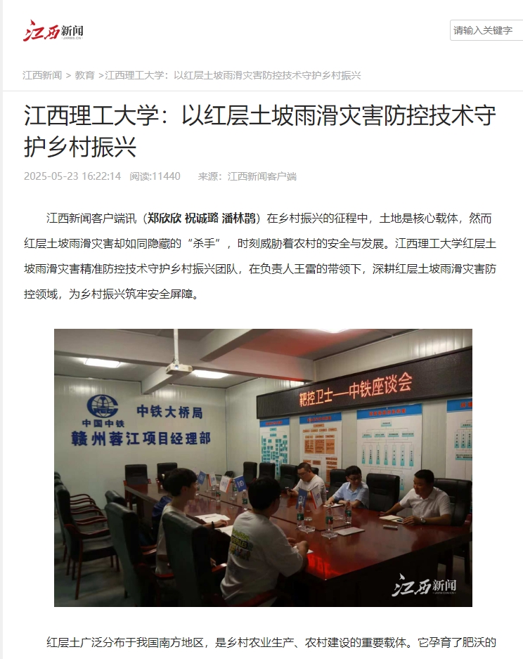 江西新闻客户端讯(郑欣欣 祝诚璐 潘林鹊)在乡村振兴的征程中,土地是核心载体,然而红层土坡雨滑灾害却如同隐藏的“杀手”,时刻威胁着农村的安全与发展。江西理工大学红层土坡雨滑灾害精准防控技术守护乡村振兴团队,在负责人王雷的带领下,深耕红层土坡雨滑灾害防控领域,为乡村振兴筑牢安全屏障。