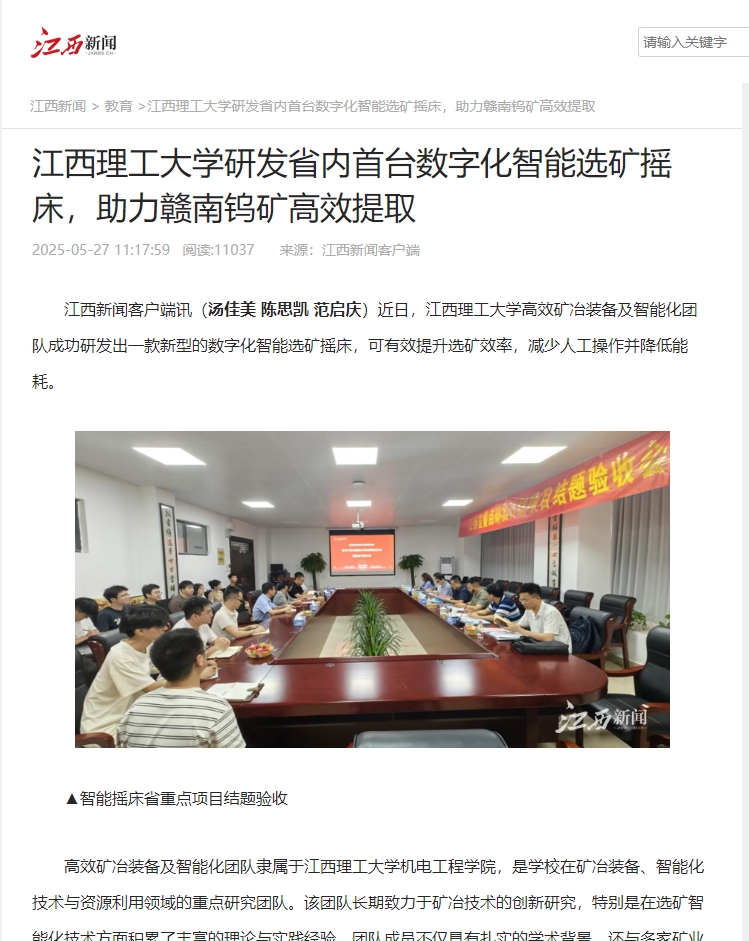 江西新闻客户端讯(汤佳美 陈思凯 范启庆)近日,江西理工大学高效矿冶装备及智能化团队成功研发出一款新型的数字化智能选矿摇床,可有效提升选矿效率,减少人工操作并降低能耗。