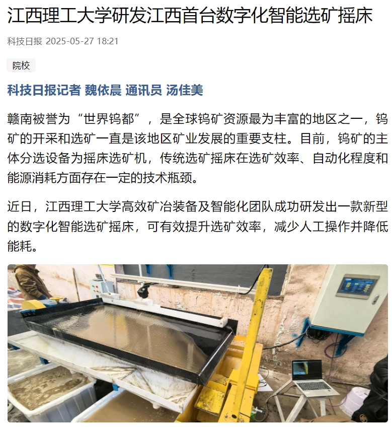 近日,江西理工大学高效矿冶装备及智能化团队成功研发出一款新型的数字化智能选矿摇床,可有效提升选矿效率,减少人工操作并降低能耗。