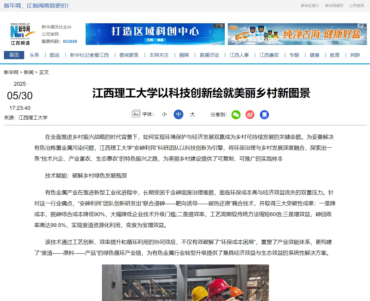 在全面推进乡村振兴战略的时代背景下,如何实现环境保护与经济发展双赢成为乡村可持续发展的关键命题。为妥善解决有色冶炼重金属污染问题,江西理工大学“安砷利民”科研团队以科技创新为引擎,将环保治理与乡村发展深度融合,探索出一条“技术兴企、产业富农、生态惠农”的特色振兴之路,为美丽乡村建设提供了可复制、可推广的实践样本