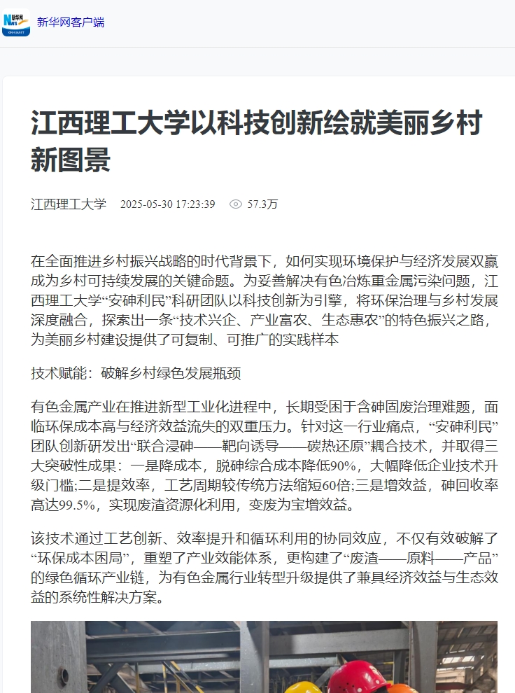 在全面推进乡村振兴战略的时代背景下,如何实现环境保护与经济发展双赢成为乡村可持续发展的关键命题。为妥善解决有色冶炼重金属污染问题,江西理工大学“安砷利民”科研团队以科技创新为引擎,将环保治理与乡村发展深度融合,探索出一条“技术兴企、产业富农、生态惠农”的特色振兴之路,为美丽乡村建设提供了可复制、可推广的实践样本