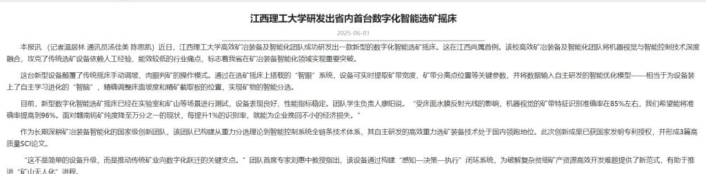 本报讯 (记者温居林 通讯员汤佳美 陈思凯)近日,江西理工大学高效矿冶装备及智能化团队成功研发出一款新型的数字化智能选矿摇床。这在江西尚属首例。该校高效矿冶装备及智能化团队将机器视觉与智能控制技术深度融合,攻克了传统选矿设备依赖人工经验、能效较低的行业痛点,标志着我省在矿冶装备智能化领域实现重要突破。