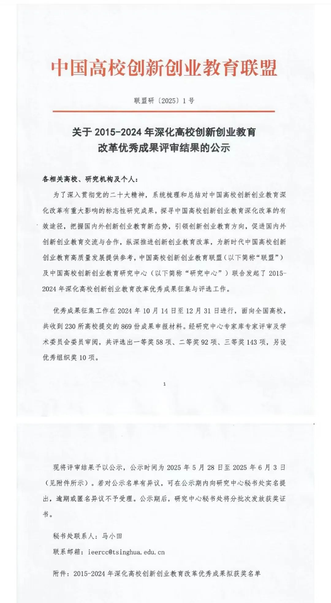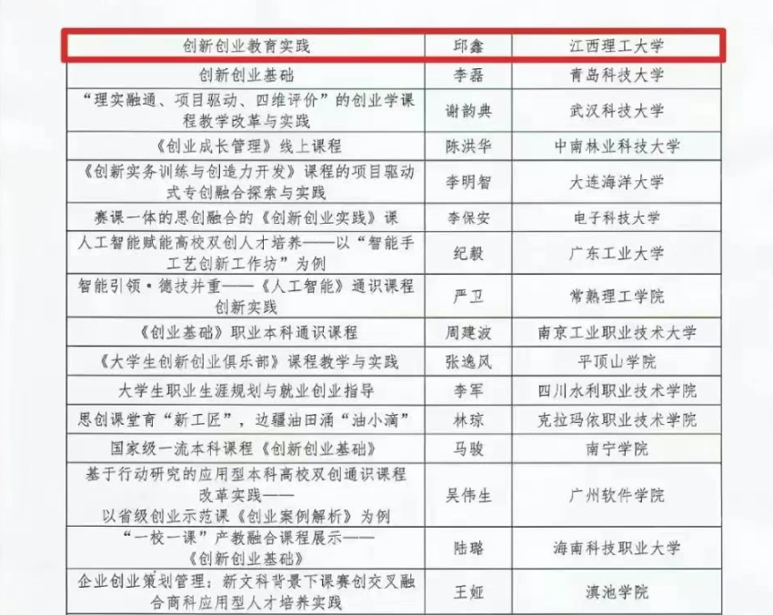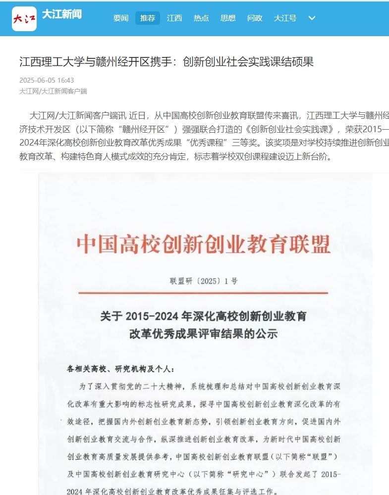 大江网/大江新闻客户端讯 近日,从中国高校创新创业教育联盟传来喜讯,江西理工大学与赣州经济技术开发区(以下简称“赣州经开区”)强强联合打造的《创新创业社会实践课》,荣获2015—2024年深化高校创新创业教育改革优秀成果“优秀课程”三等奖。该奖项是对学校持续推进创新创业教育改革、构建特色育人模式成效的充分肯定,标志着学校双创课程建设迈上新台阶。
