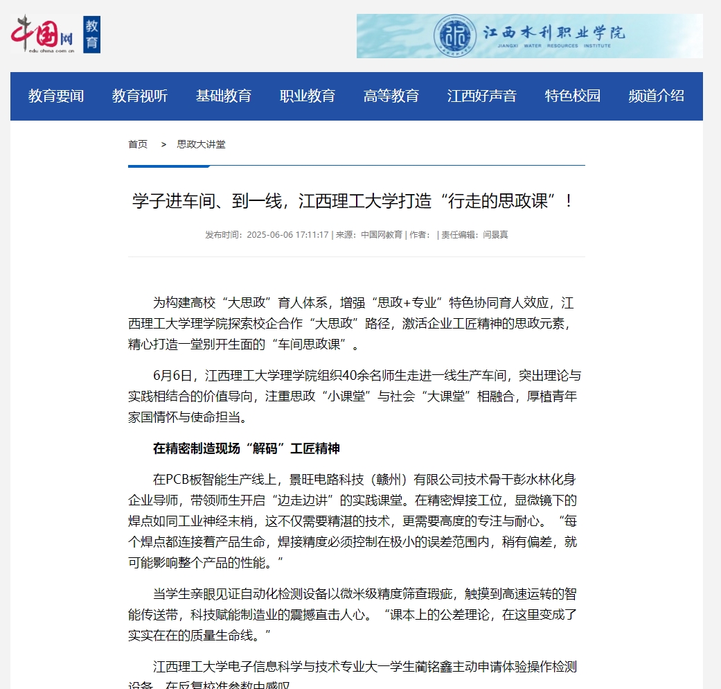 与传统课堂不同,这场思政课充满“主动担当”的生动场景:江西理工大学电子信息科学与技术专业大三学生陈熙宇提出“跟岗质检1小时”的想法,并在精密仪器前逐一审校200余个焊点;电子信息科学与技术专业小组自发录制生产流程视频,计划制作“常见设计错误与工厂无法生产的典型案例”微课;12名学生现场组建“工匠精神”学习小组,作下“每月走进一个车间”的小组实践约定。“以前总觉得思政课是听道理,今天在流水线旁算良品率、在操作台上调参数,才真正理解什么是‘把论文写在祖国大地上’。”学生代表张智分享道。这种从“被动倾听”到“主动学习”的转变,正是这堂车间思政课的生动注脚。