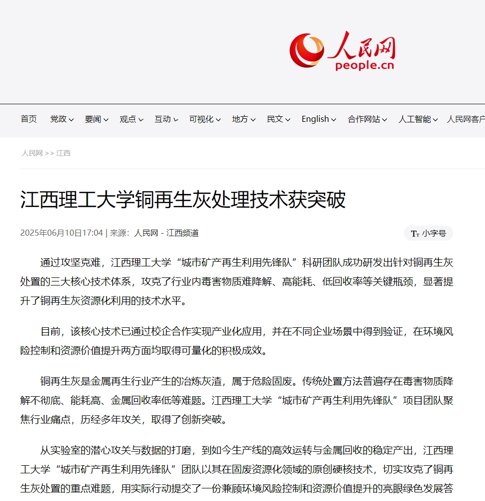 《人民网》:江西理工大学铜再生灰处理技术获突破