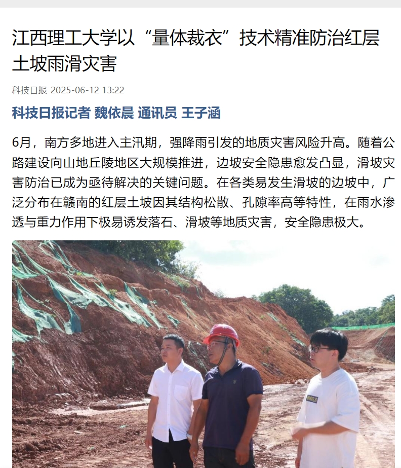 不仅如此,团队也取得了显著成效,在2023年,团队项目荣获江西省科技进步奖一等奖。截至2025年,江西理工大学“滑”险为夷团队十余年的坚守与创新,成功攻克了红层土坡雨滑灾害精准防控的难题。