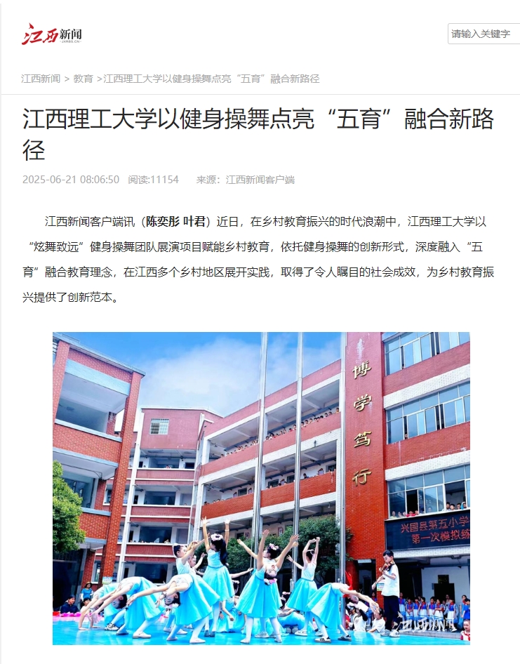 江西新闻客户端讯(陈奕彤 叶君)近日,在乡村教育振兴的时代浪潮中,江西理工大学以“炫舞致远”健身操舞团队展演项目赋能乡村教育,依托健身操舞的创新形式,深度融入“五育”融合教育理念,在江西多个乡村地区展开实践,取得了令人瞩目的社会成效,为乡村教育振兴提供了创新范本。