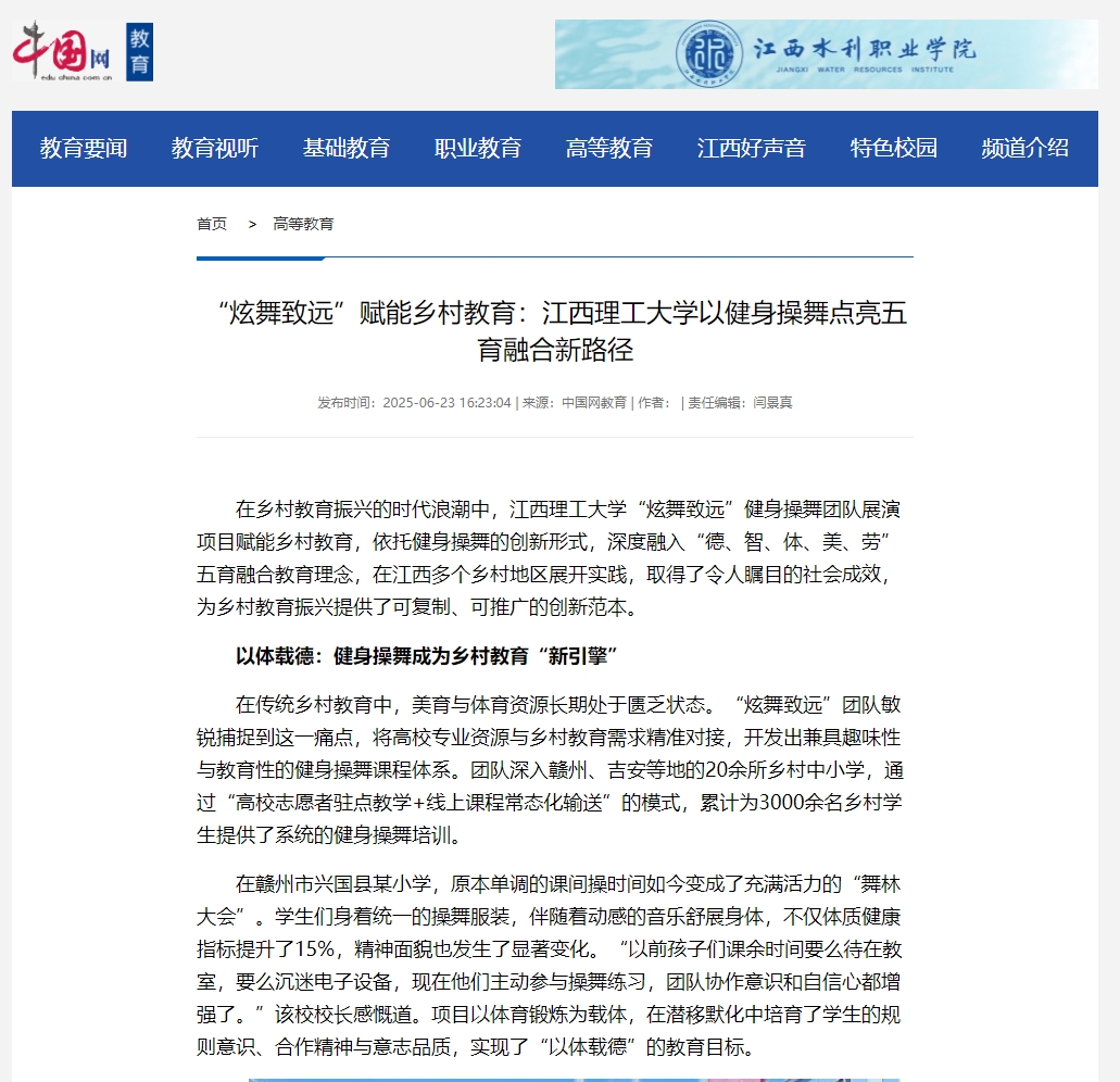 在乡村教育振兴的时代浪潮中,江西理工大学“炫舞致远”健身操舞团队展演项目赋能乡村教育,依托健身操舞的创新形式,深度融入“德、智、体、美、劳”五育融合教育理念,在江西多个乡村地区展开实践,取得了令人瞩目的社会成效,为乡村教育振兴提供了可复制、可推广的创新范本。
