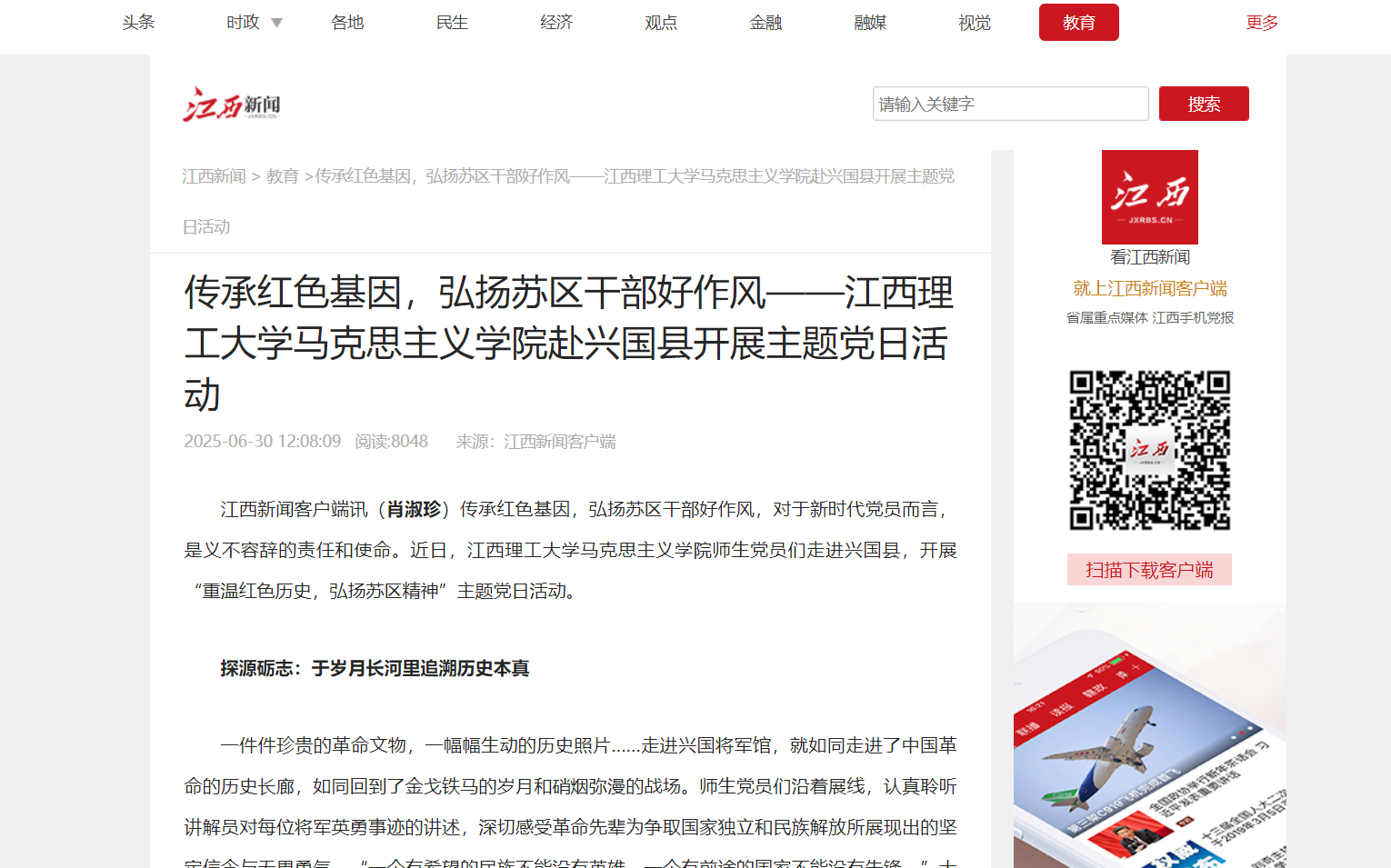江西新闻客户端讯(肖淑珍)传承红色基因,弘扬苏区干部好作风,对于新时代党员而言,是义不容辞的责任和使命。近日,江西理工大学马克思主义学院师生党员们走进兴国县,开展“重温红色历史,弘扬苏区精神”主题党日活动。