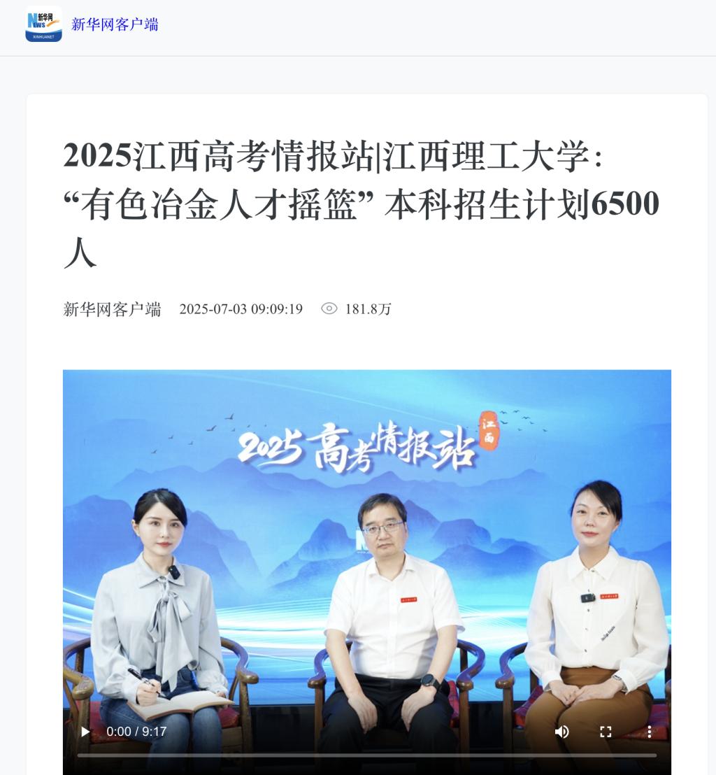 为搭建高校与考生、家长间的沟通桥梁,助力升学决策更科学高效,近日,新华网邀请了江西理工大学党委常委、副校长黄志繁,江西理工大学招生与就业工作处处长邓晓宇做客“2025江西高考情报站”,围绕2025年学校招生专业设置变化、招生计划、人才培养特色等方面,回答考生及家长们的关切问题,介绍相关情况。