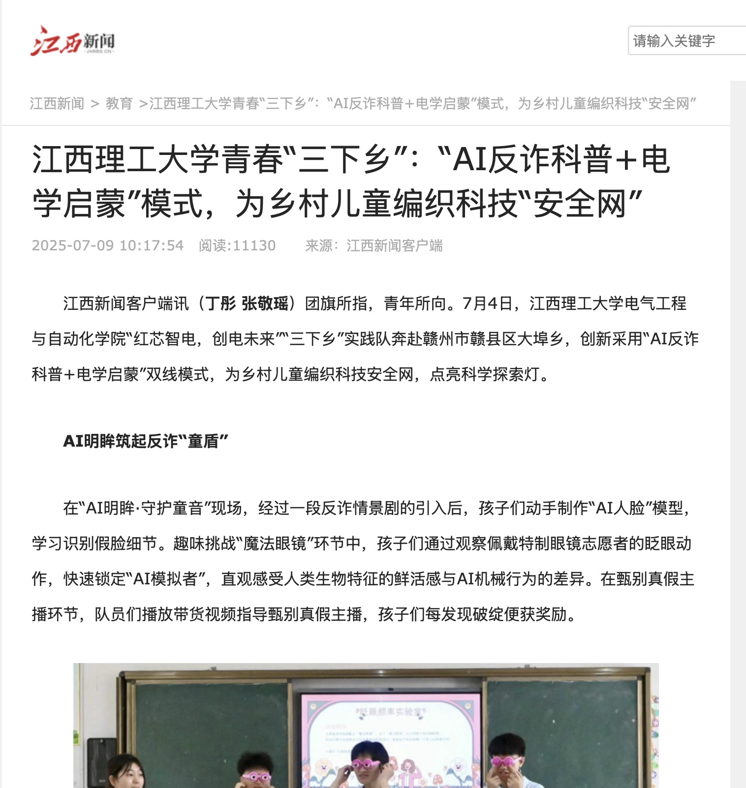 江西新闻客户端讯(丁彤 张敬瑶)团旗所指,青年所向。7月4日,江西理工大学电气工程与自动化学院“红芯智电,创电未来”“三下乡”实践队奔赴赣州市赣县区大埠乡,创新采用“AI反诈科普+电学启蒙”双线模式,为乡村儿童编织科技安全网,点亮科学探索灯。