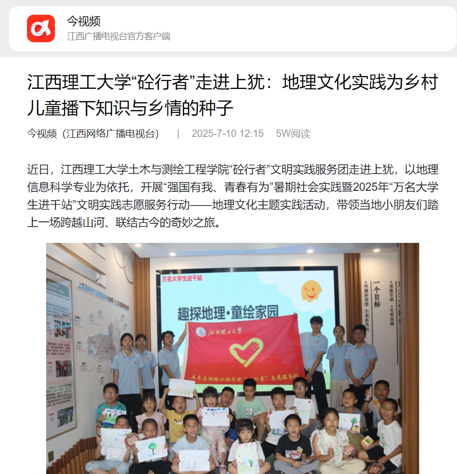 近日,江西理工大学土木与测绘工程学院“砼行者”文明实践服务团走进上犹,以地理信息科学专业为依托,开展“强国有我、青春有为”暑期社会实践暨2025年“万名大学生进千站”文明实践志愿服务行动——地理文化主题实践活动,带领当地小朋友们踏上一场跨越山河、联结古今的奇妙之旅。