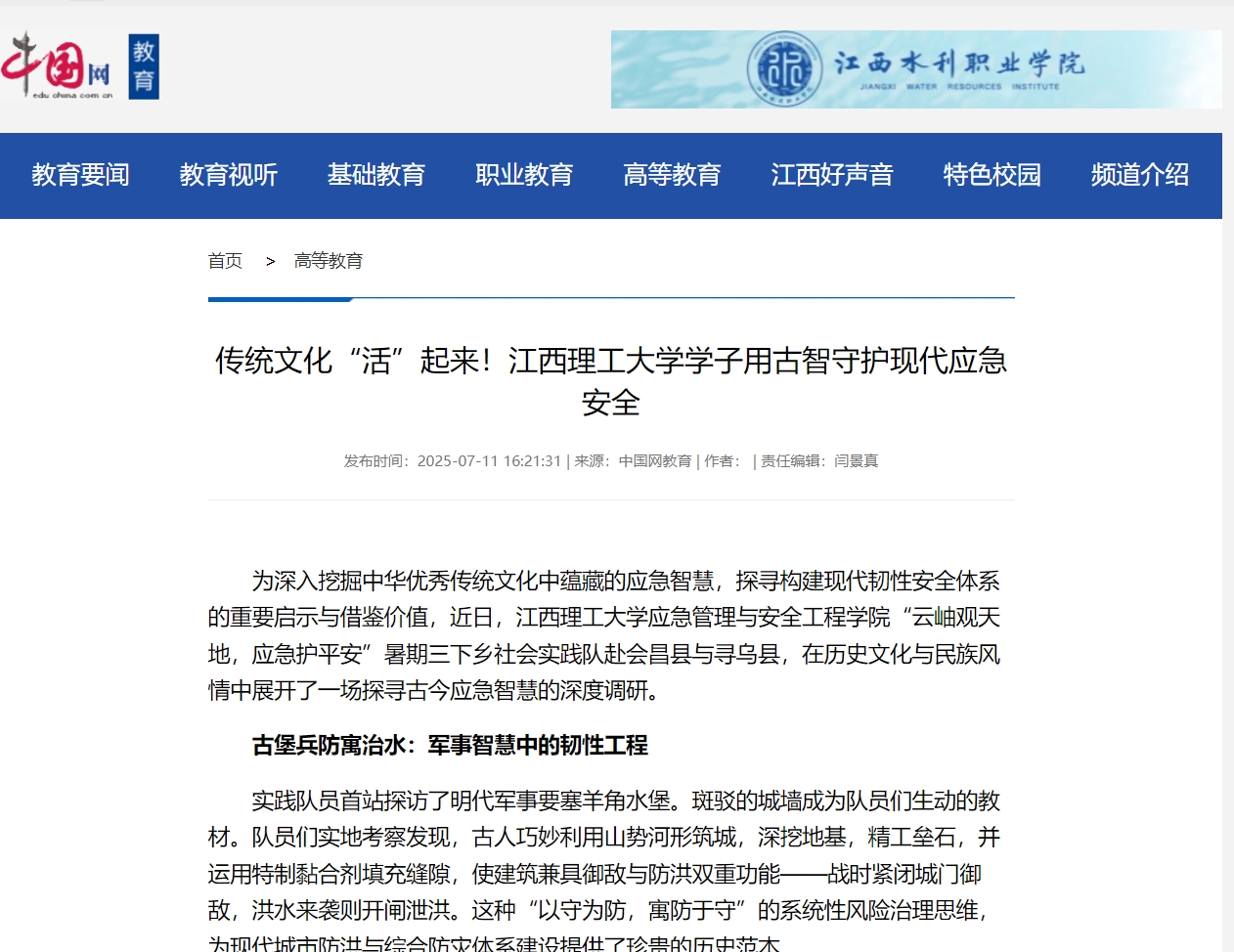 为深入挖掘中华优秀传统文化中蕴藏的应急智慧,探寻构建现代韧性安全体系的重要启示与借鉴价值,近日,江西理工大学应急管理与安全工程学院“云岫观天地,应急护平安”暑期三下乡社会实践队赴会昌县与寻乌县,在历史文化与民族风情中展开了一场探寻古今应急智慧的深度调研。