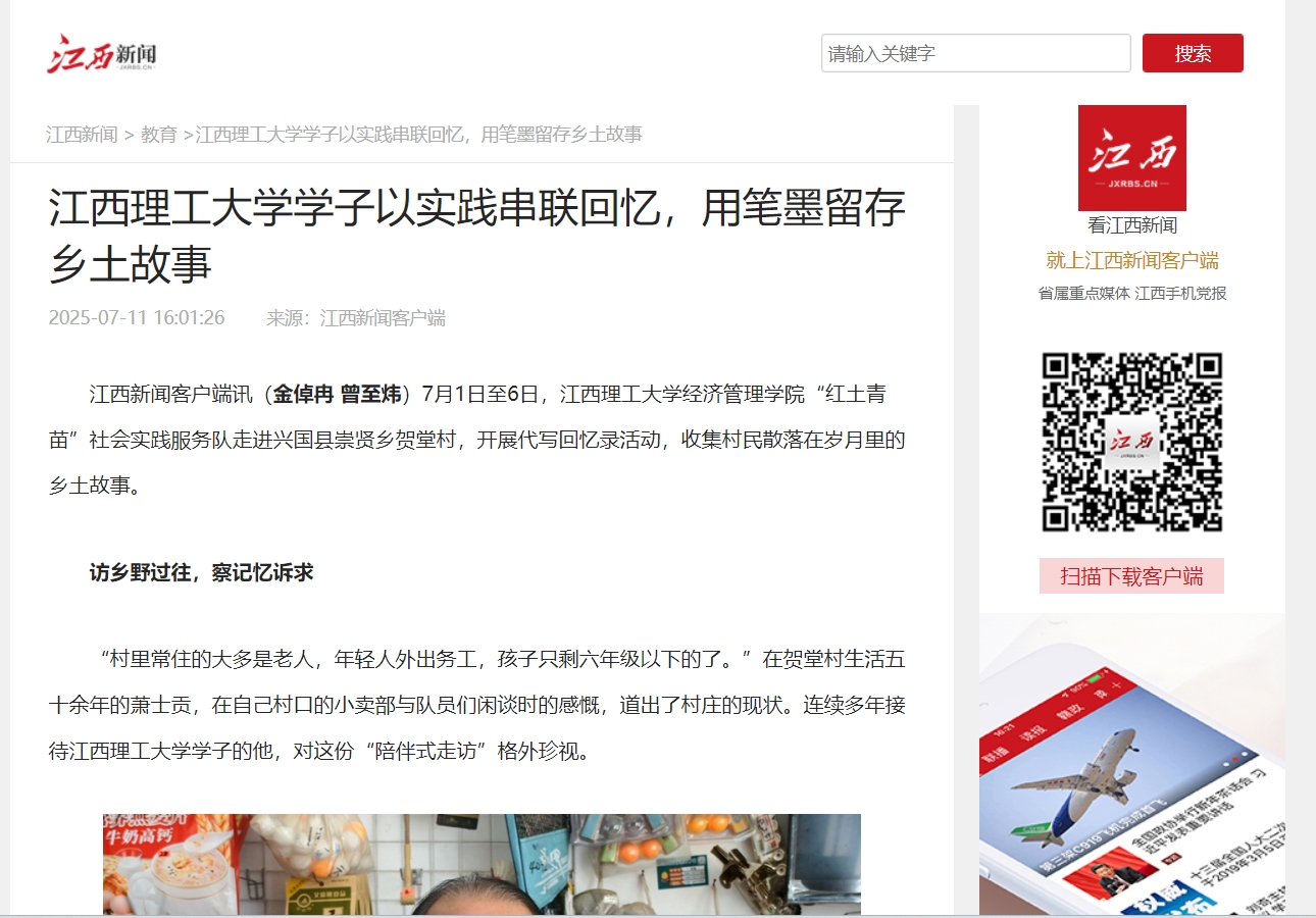 江西新闻客户端讯(金倬冉 曾至炜)7月1日至6日,江西理工大学经济管理学院“红土青苗”社会实践服务队走进兴国县崇贤乡贺堂村,开展代写回忆录活动,收集村民散落在岁月里的乡土故事。