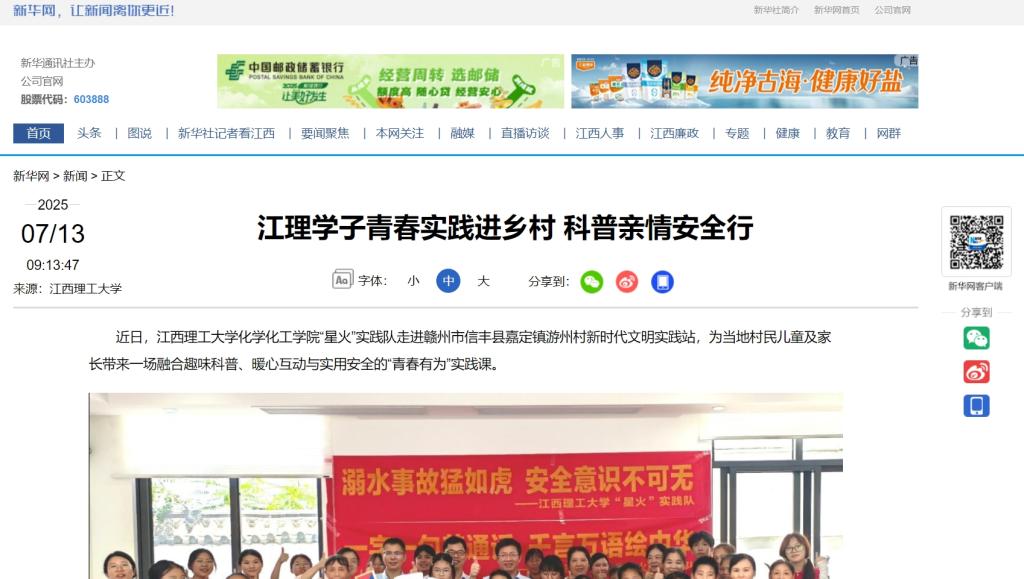 此次“星火”实践队的游州村之行,是“万名大学生进千站”行动的生动缩影。队员们发挥专业所长,将化学知识化为趣味科普;巧设亲子游戏,架起心灵桥梁;筑牢安全课堂,守护生命成长。他们用专业知识服务基层,以青春热情奉献社会,在服务乡村振兴的火热实践中,践行“强国有我,青春有为”的使命担当,让科学探索的精神和人文关怀的暖流在乡间传递。(李敏、刘志豪)