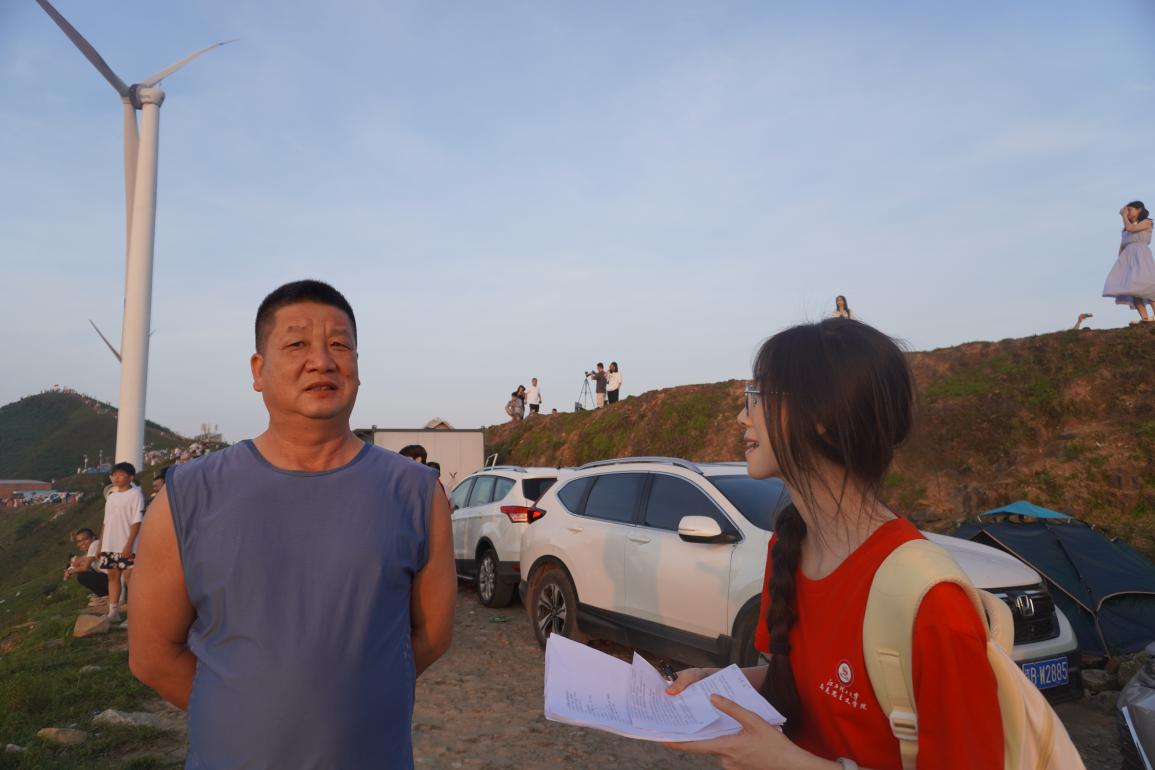 于草山之巅,团队成员手持问卷和访谈提纲,穿梭在陆续抵达的游客之间。调研中,游客们对草山风光的赞美不绝于耳:“日出太震撼了,这是我第一次看日出!”“这空气,值了!城市里可呼吸不到!”