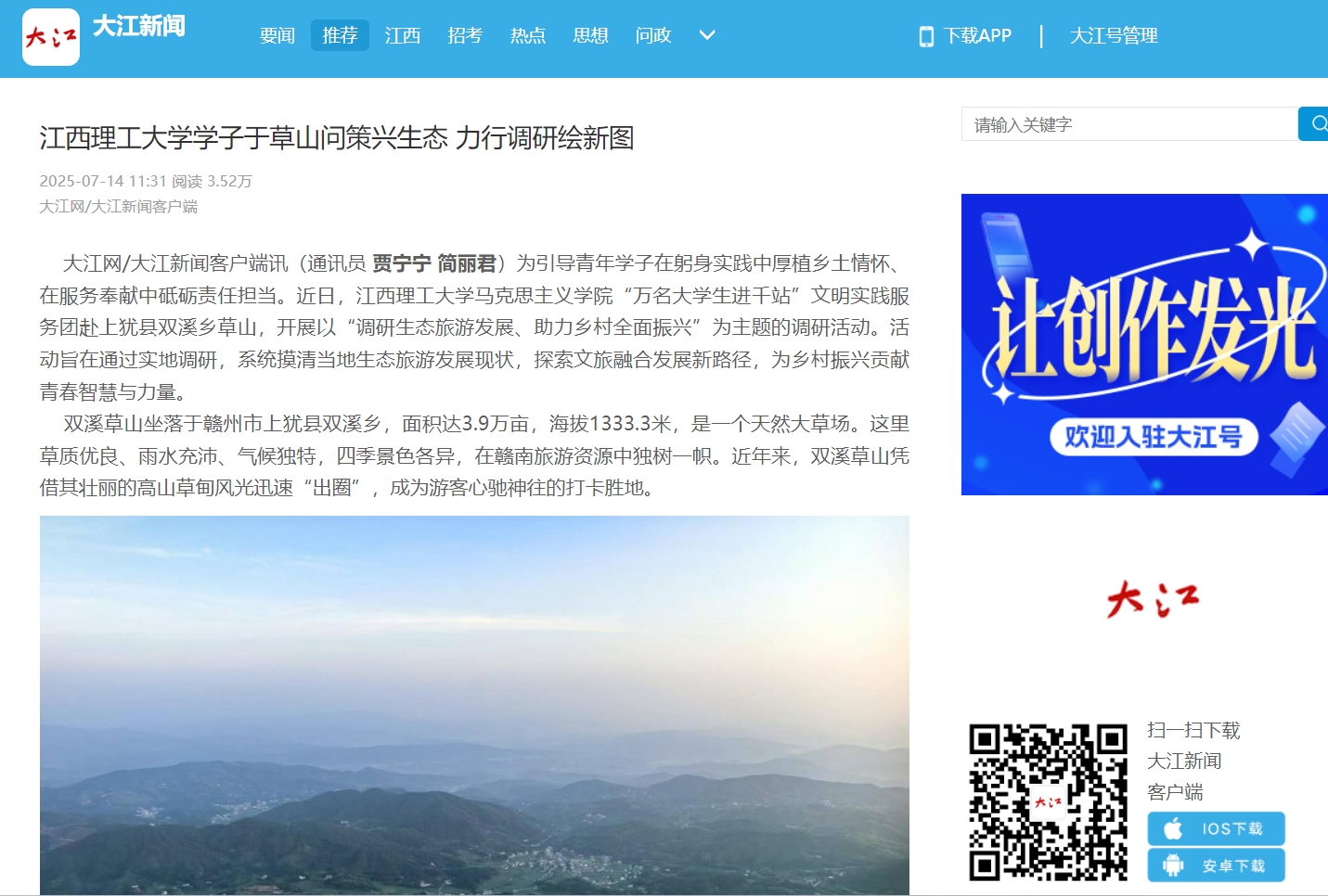 大江网/大江新闻客户端讯(通讯员贾宁宁 简丽君)为引导青年学子在躬身实践中厚植乡土情怀、在服务奉献中砥砺责任担当。近日,江西理工大学马克思主义学院“万名大学生进千站”文明实践服务团赴上犹县双溪乡草山,开展以“调研生态旅游发展、助力乡村全面振兴”为主题的调研活动。活动旨在通过实地调研,系统摸清当地生态旅游发展现状,探索文旅融合发展新路径,为乡村振兴贡献青春智慧与力量。