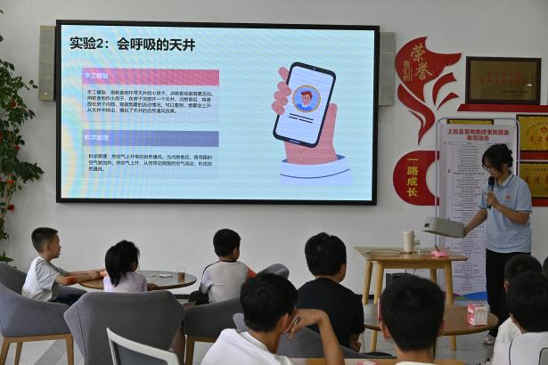 “会呼吸的天井”实验更是将课堂氛围推向高潮。队员们用透明盒子模拟房屋,点燃线香制造烟雾,当热空气带着烟雾从“天井”排出,形成空气流动时,小朋友们围在实验装置旁,眼睛瞪得圆圆的,嘴里不停发出“哇”的惊叹。有个小朋友还主动说:“我回家要和爸爸妈妈说,我们家的窗户也要这样设计!”