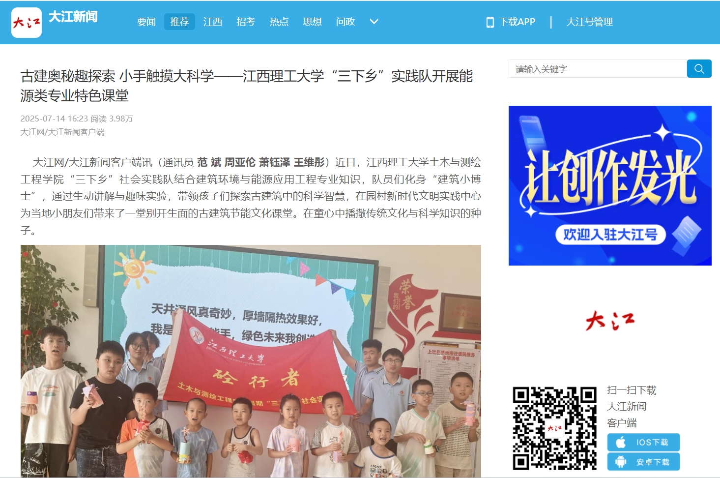 大江网/大江新闻客户端讯(通讯员范 斌 周亚伦 萧钰泽 王维彤)近日,江西理工大学土木与测绘工程学院“三下乡”社会实践队结合建筑环境与能源应用工程专业知识,队员们化身“建筑小博士”,通过生动讲解与趣味实验,带领孩子们探索古建筑中的科学智慧,在园村新时代文明实践中心为当地小朋友们带来了一堂别开生面的古建筑节能文化课堂。在童心中播撒传统文化与科学知识的种子。