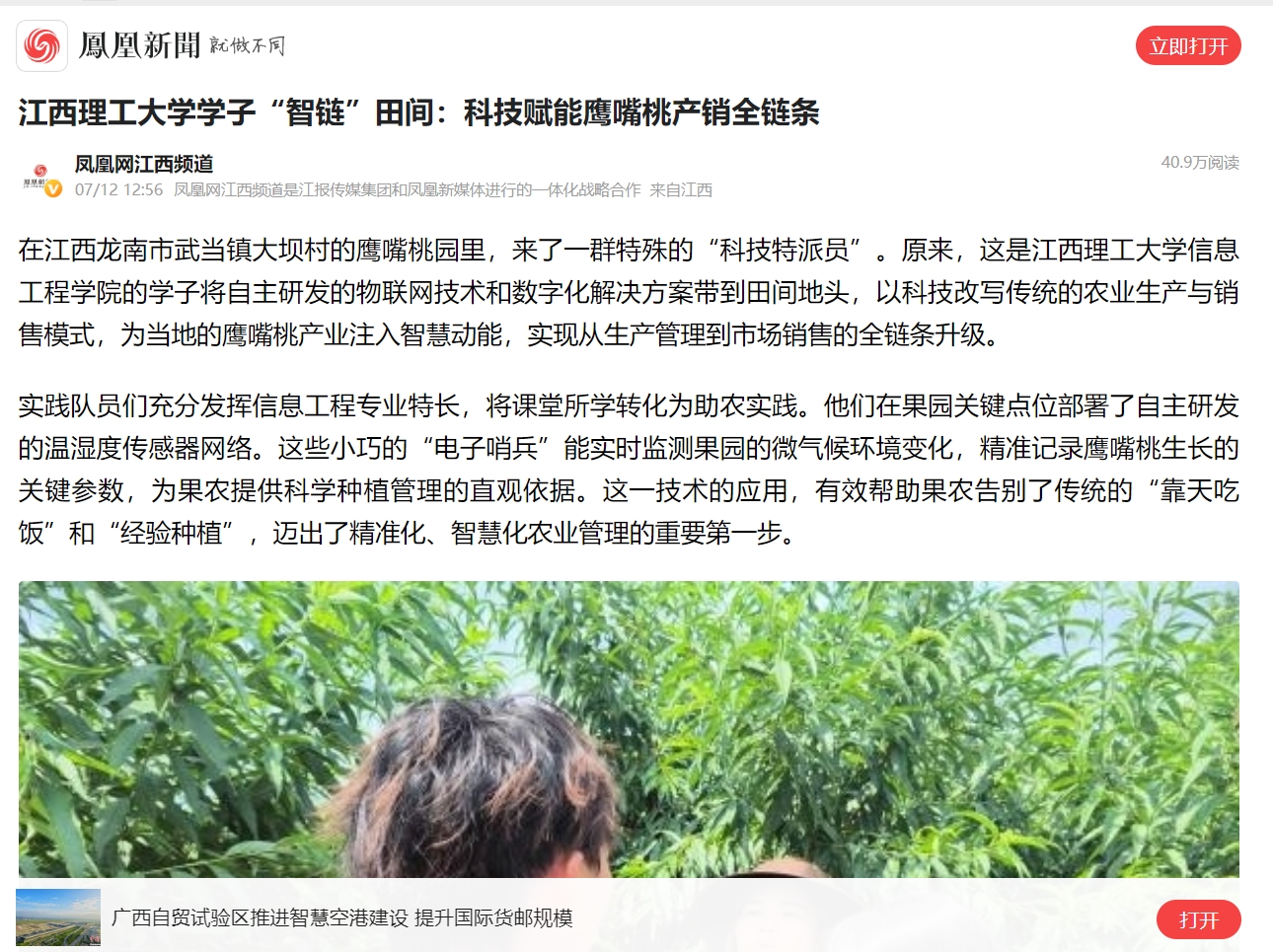 江西理工大学信息工程学院通过此次社会实践活动,不仅为龙南鹰嘴桃产业插上了数字化翅膀,有效促进了农民增收,更探索出一条可复制、可推广的“高校智慧助农”新路径,充分彰显了新时代青年学子学以致用、服务社会、贡献乡村的责任担当。(文/胡宇芩、刘晨曦)