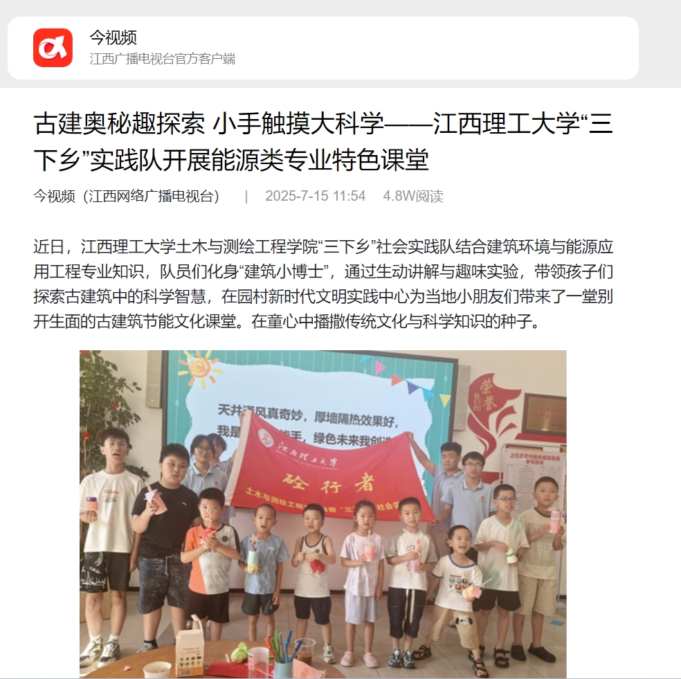 近日,江西理工大学土木与测绘工程学院“三下乡”社会实践队结合建筑环境与能源应用工程专业知识,队员们化身“建筑小博士”,通过生动讲解与趣味实验,带领孩子们探索古建筑中的科学智慧,在园村新时代文明实践中心为当地小朋友们带来了一堂别开生面的古建筑节能文化课堂。在童心中播撒传统文化与科学知识的种子。
