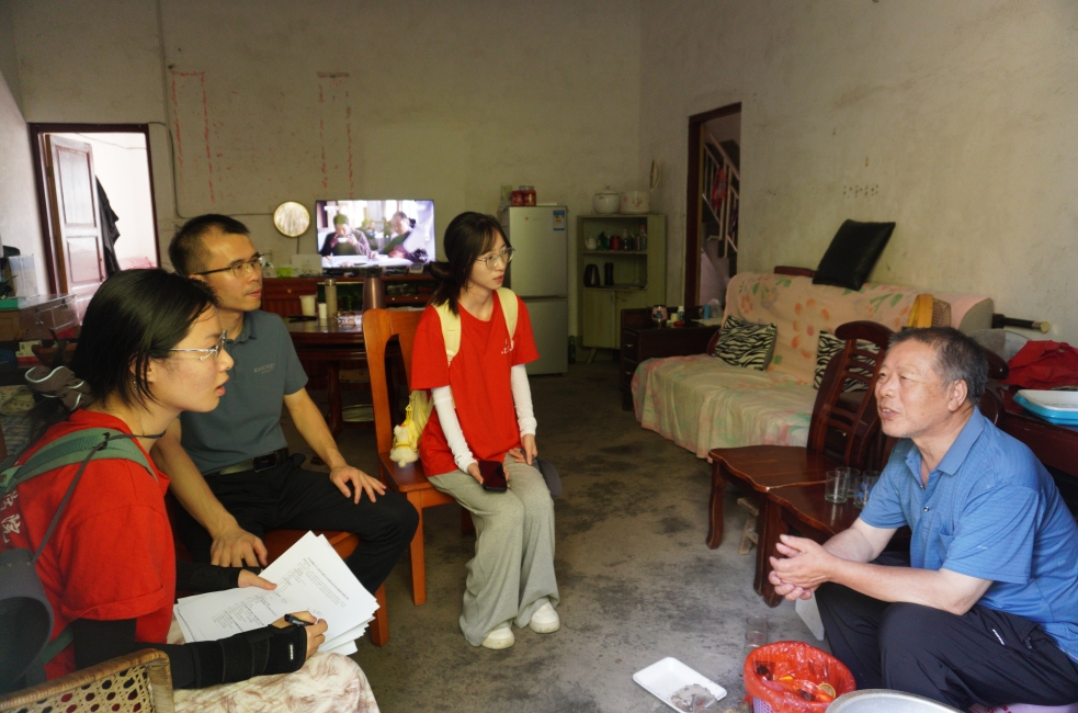 团队成员通过问卷调查、入户访谈等形式,与村民展开深度对话,了解古建筑保护现状、民俗文化传承及产业发展状况,并收集了村民对村落后续发展的建议。其中一位村民说道:“希望你们大学生把卢光稠的故事讲好,弄成个能招人的景点。人气旺了,游客多了,我们的土货和手艺活自然能卖上好价钱!”大家认真记录村民的建议,为后续古村落保护与活化利用研究提供参考。