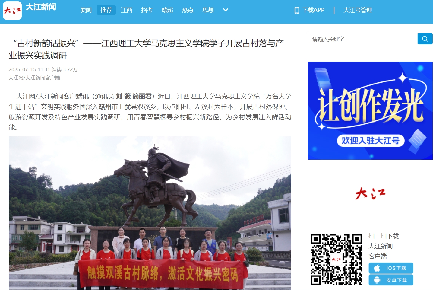 大江网/大江新闻客户端讯(通讯员刘 薇 简丽君)近日,江西理工大学马克思主义学院“万名大学生进千站”文明实践服务团深入赣州市上犹县双溪乡,以卢阳村、左溪村为样本,开展古村落保护、旅游资源开发及特色产业发展实践调研,用青春智慧探寻乡村振兴新路径,为乡村发展注入鲜活动能。