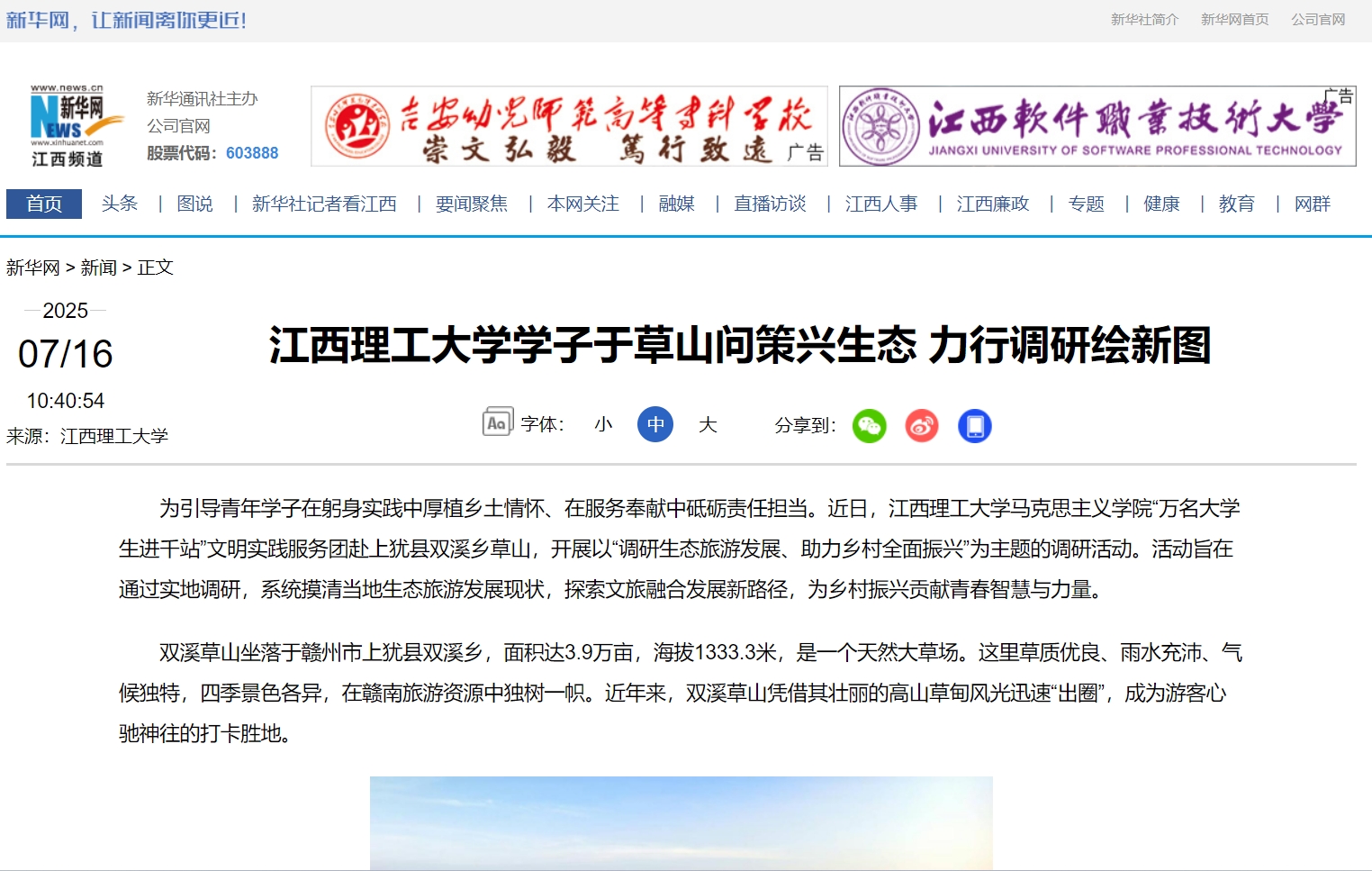 为引导青年学子在躬身实践中厚植乡土情怀、在服务奉献中砥砺责任担当。近日,江西理工大学马克思主义学院“万名大学生进千站”文明实践服务团赴上犹县双溪乡草山,开展以“调研生态旅游发展、助力乡村全面振兴”为主题的调研活动。活动旨在通过实地调研,系统摸清当地生态旅游发展现状,探索文旅融合发展新路径,为乡村振兴贡献青春智慧与力量。