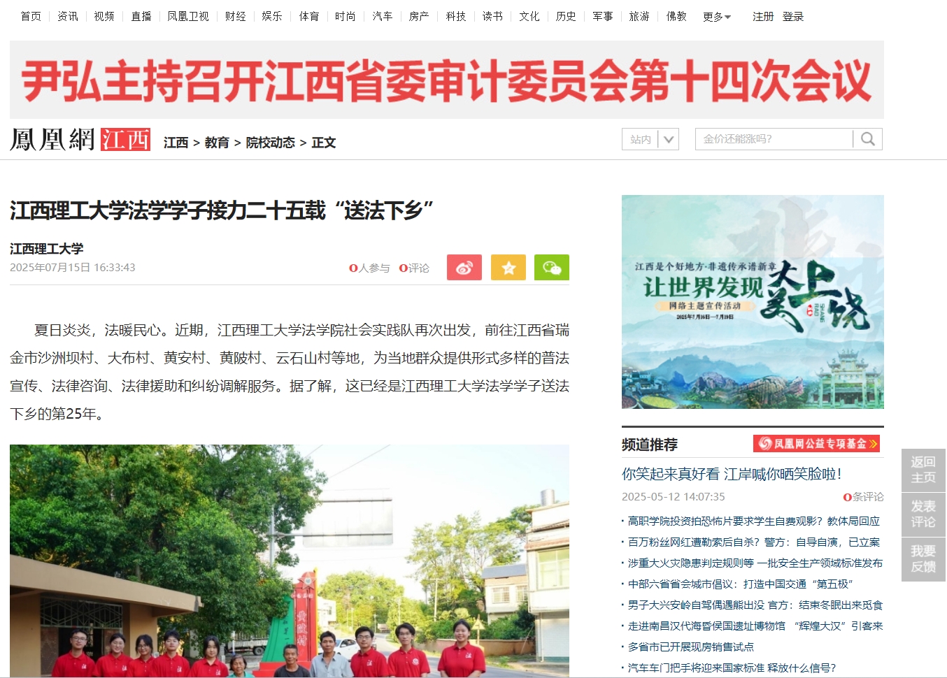 据悉,江西理工大学法学院社会实践队依托法学专业特色,自2000年起,每年都会组建社会实践队,百余名法学学子接力送法下乡,采取法治宣讲、漫画普法、文艺普法等多种形式开展普法宣传,并入村入户开展普法宣传、法律咨询、法律援助、纠纷调解等服务。截至目前,共开展各类普法活动8200余场,惠及12万余人次。(文/彭钰婷、涂子萱 图/高溶阳、倪晨雪、林顺利)