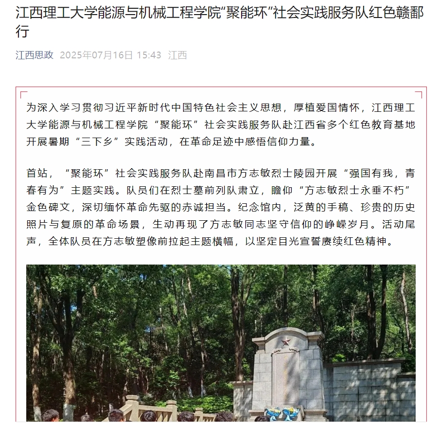 为深入学习贯彻习近平新时代中国特色社会主义思想,厚植爱国情怀,江西理工大学能源与机械工程学院“聚能环”社会实践服务队赴江西省多个红色教育基地开展暑期“三下乡”实践活动,在革命足迹中感悟信仰力量。