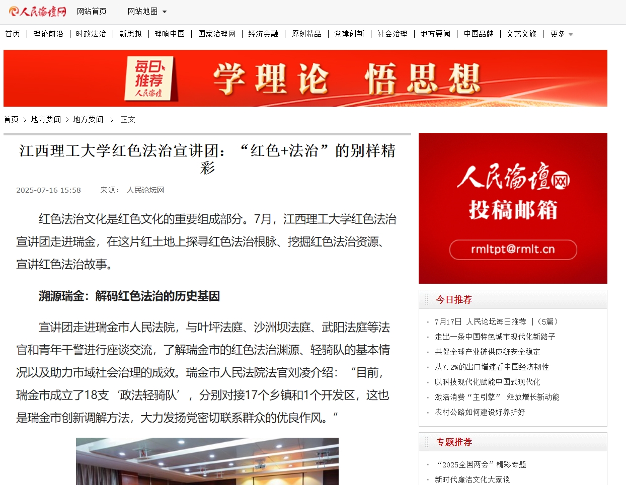 红色法治文化是红色文化的重要组成部分。7月,江西理工大学红色法治宣讲团走进瑞金,在这片红土地上探寻红色法治根脉、挖掘红色法治资源、宣讲红色法治故事。