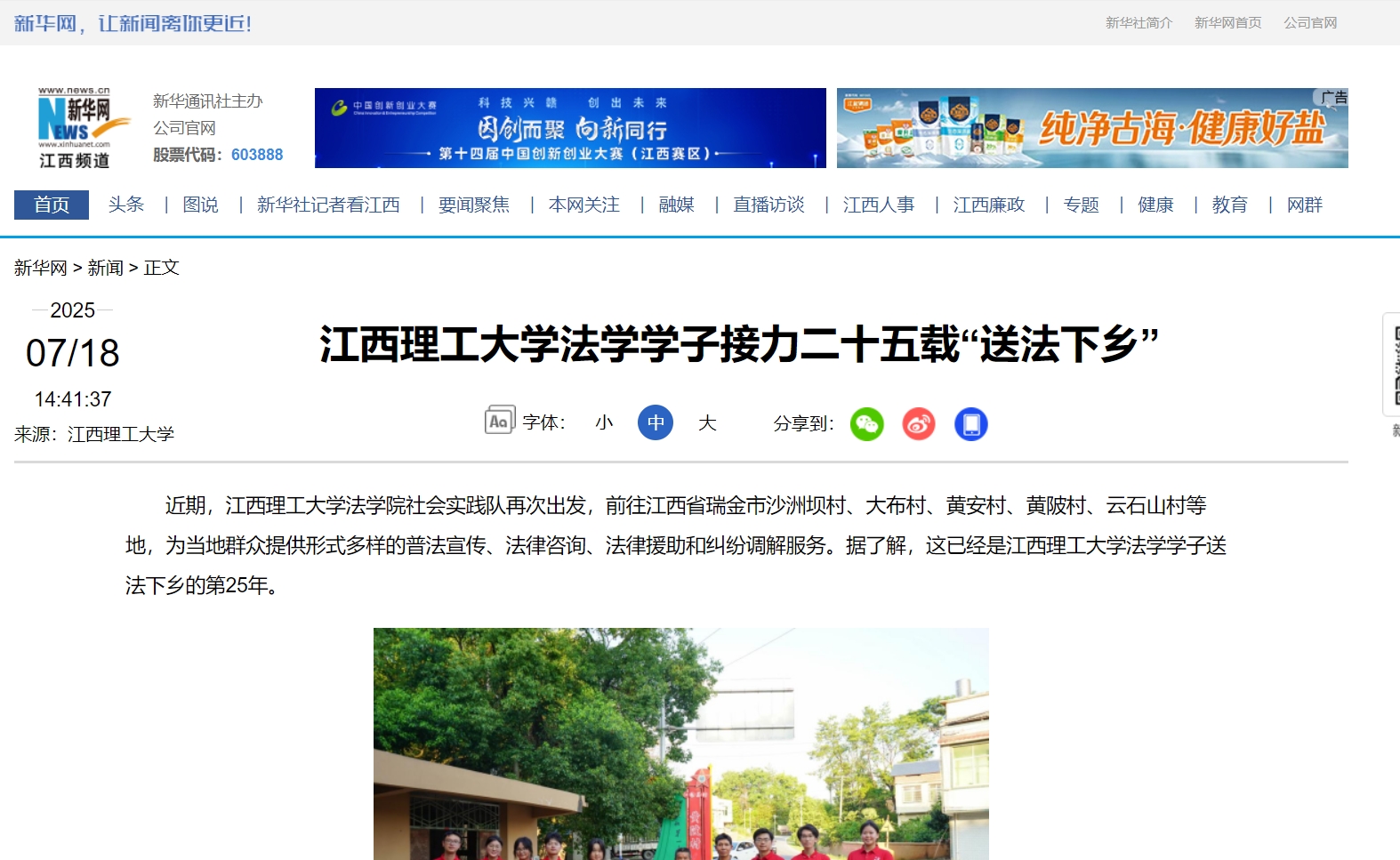 据悉,江西理工大学法学院社会实践队依托法学专业特色,自2000年起,每年都会组建社会实践队,百余名法学学子接力送法下乡,采取法治宣讲、漫画普法、文艺普法等多种形式开展普法宣传,并入村入户开展普法宣传、法律咨询、法律援助、纠纷调解等服务。截至目前,共开展各类普法活动8200余场,惠及12万余人次。(彭钰婷、涂子萱、高溶阳、倪晨雪、林顺利)