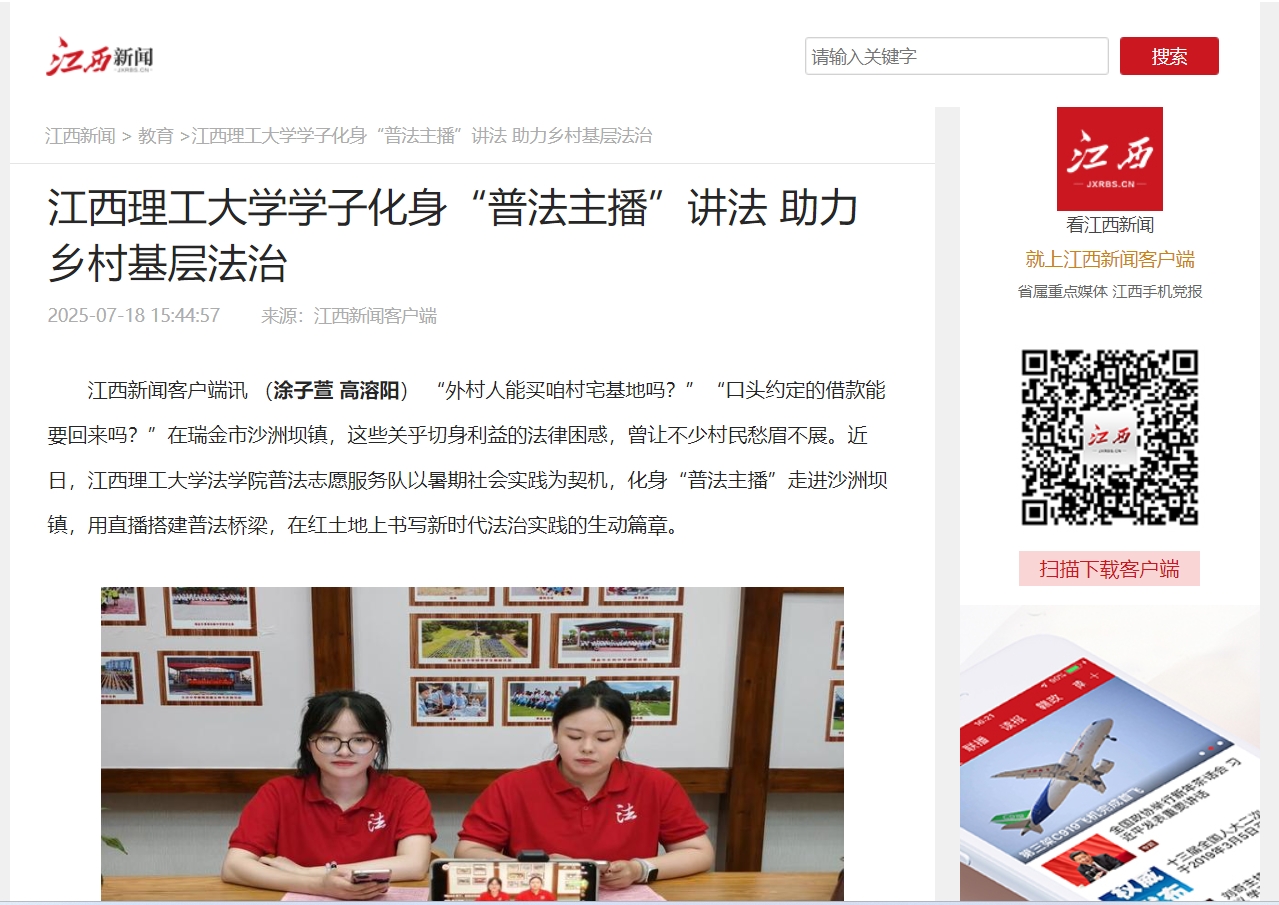 江西新闻客户端讯 (涂子萱 高溶阳) “外村人能买咱村宅基地吗?”“口头约定的借款能要回来吗?”在瑞金市沙洲坝镇,这些关乎切身利益的法律困惑,曾让不少村民愁眉不展。近日,江西理工大学法学院普法志愿服务队以暑期社会实践为契机,化身“普法主播”走进沙洲坝镇,用直播搭建普法桥梁,在红土地上书写新时代法治实践的生动篇章。