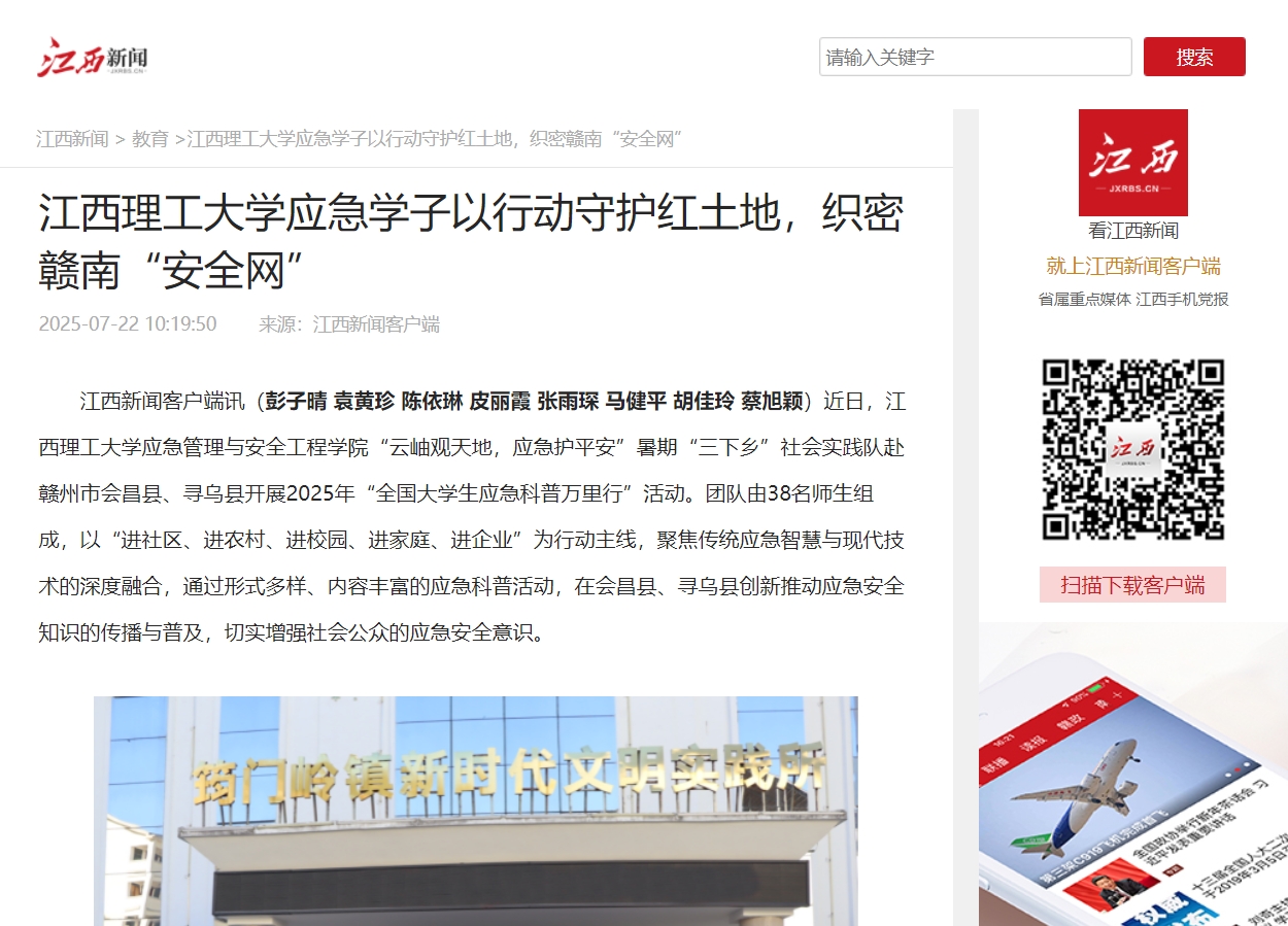 江西新闻客户端讯(彭子晴 袁黄珍 陈依琳 皮丽霞 张雨琛 马健平 胡佳玲 蔡旭颖)近日,江西理工大学应急管理与安全工程学院“云岫观天地,应急护平安”暑期“三下乡”社会实践队赴赣州市会昌县、寻乌县开展2025年“全国大学生应急科普万里行”活动。团队由38名师生组成,以“进社区、进农村、进校园、进家庭、进企业”为行动主线,聚焦传统应急智慧与现代技术的深度融合,通过形式多样、内容丰富的应急科普活动,在会昌县、寻乌县创新推动应急安全知识的传播与普及,切实增强社会公众的应急安全意识。