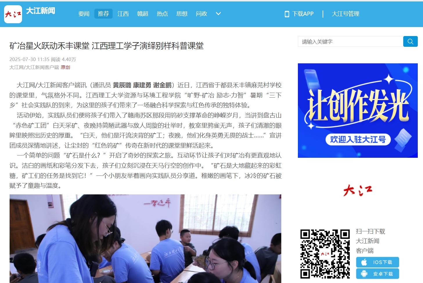 大江网/大江新闻客户端讯(通讯员黄辰璐 康建勇 谢金鹏)近日,江西省于都县禾丰镇麻芫村学校的课堂里,气氛格外不同。江西理工大学资源与环境工程学院“旷野·矿冶 励志·力智”暑期“三下乡”社会实践队的到来,为这里的孩子们带来了一场融合科学探索与红色传承的独特体验。