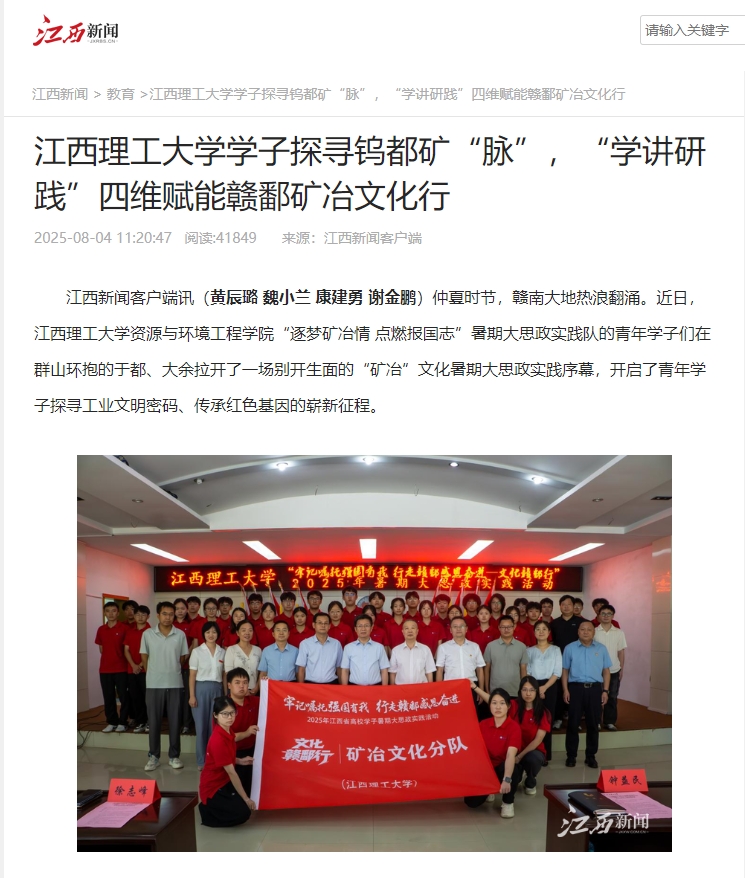 仲夏时节,赣南大地热浪翻涌。近日,江西理工大学资源与环境工程学院“逐梦矿冶情 点燃报国志”暑期大思政实践队的青年学子们在群山环抱的于都、大余拉开了一场别开生面的“矿冶”文化暑期大思政实践序幕,开启了青年学子探寻工业文明密码、传承红色基因的崭新征程。
