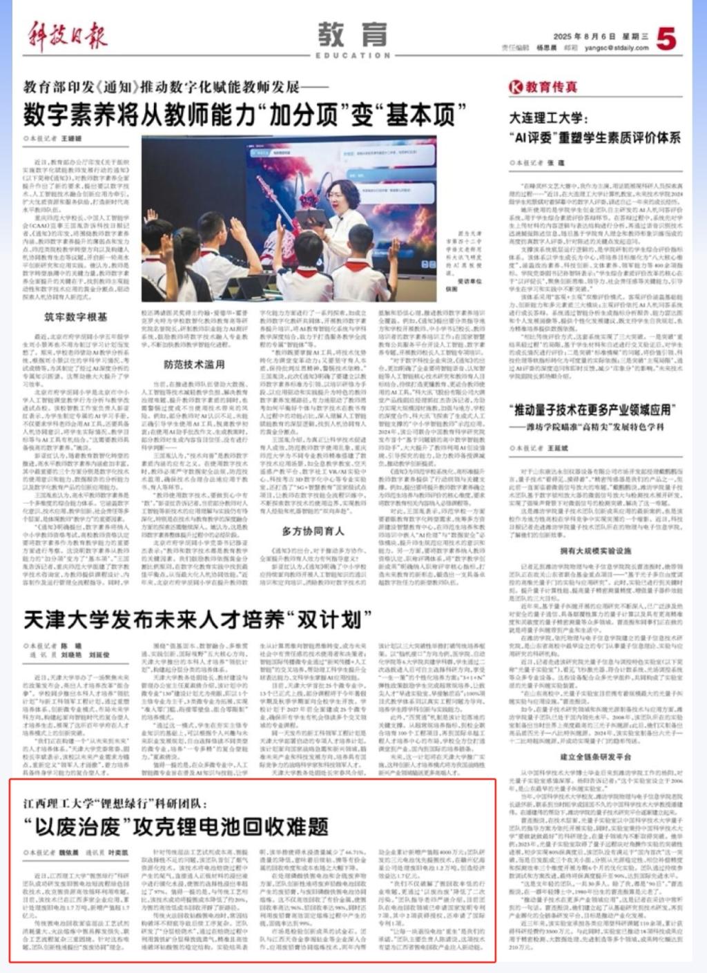 近日,江西理工大学“锂想绿行”科研团队成功研发废旧锂电池短流程绿色回收技术,攻克锂资源高效循环利用难题。目前,该技术已在江西多家企业应用,累计处理废旧电池1.7万吨,新增产值超1.7亿元。