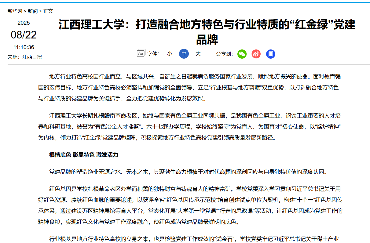 江西理工大学长期扎根赣南革命老区,始终与国家有色金属工业同频共振,是我国有色金属工业、钢铁工业重要的人才培养和科研基地,被誉为“有色冶金人才摇篮”。六十七载办学历程,学校始终坚守“为党育人、为国育才”初心使命,以“熔炉精神”为内核,倾力打造“红金绿”党建品牌矩阵,积极探索地方行业特色高校党建引领高质量发展新路径。