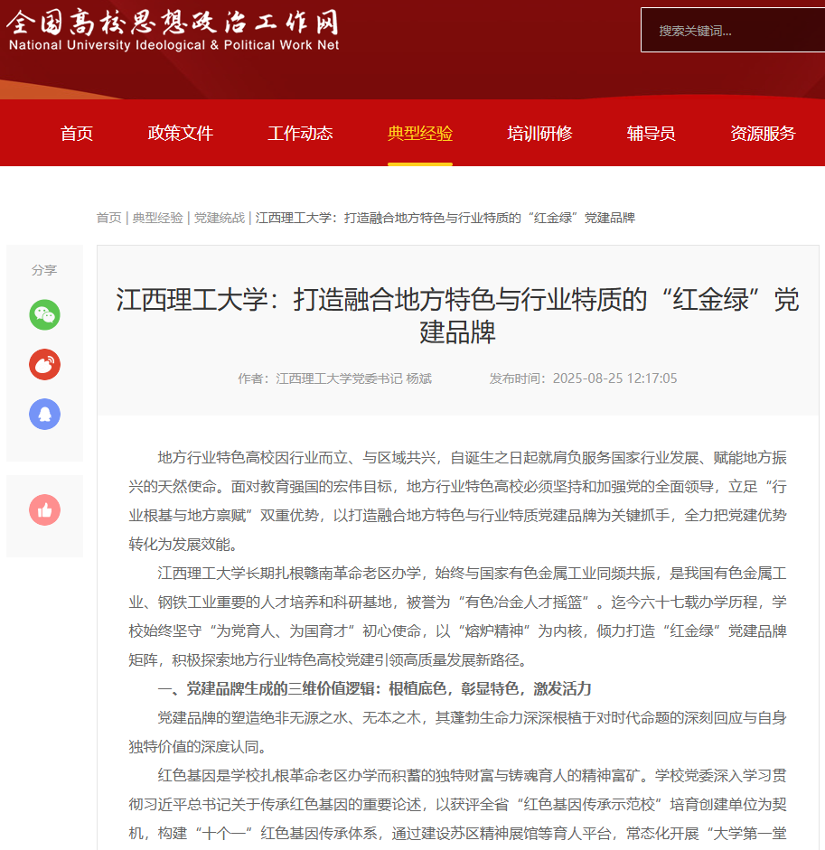 江西理工大学长期扎根赣南革命老区办学,始终与国家有色金属工业同频共振,是我国有色金属工业、钢铁工业重要的人才培养和科研基地,被誉为“有色冶金人才摇篮”。迄今六十七载办学历程,学校始终坚守“为党育人、为国育才”初心使命,以“熔炉精神”为内核,倾力打造“红金绿”党建品牌矩阵,积极探索地方行业特色高校党建引领高质量发展新路径。