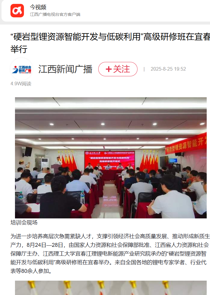 为进一步培养高层次急需紧缺人才,支撑引领经济社会高质量发展、推动形成新质生产力,8月24日—28日,由国家人力资源和社会保障部批准、江西省人力资源和社会保障厅主办、江西理工大学宜春江理锂电新能源产业研究院承办的“硬岩型锂资源智能开发与低碳利用”高级研修班在宜春举办。来自全国各地的锂电专家学者、行业代表等80余人参加。