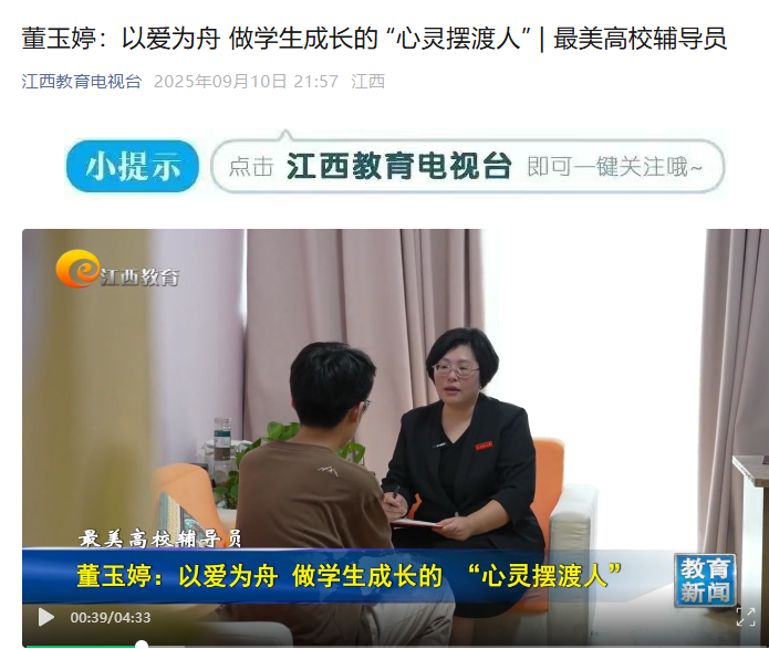 《江西教育电视台》:董玉婷:以爱为舟 做学生成长的 “心灵摆渡人” | 最美高校辅导员