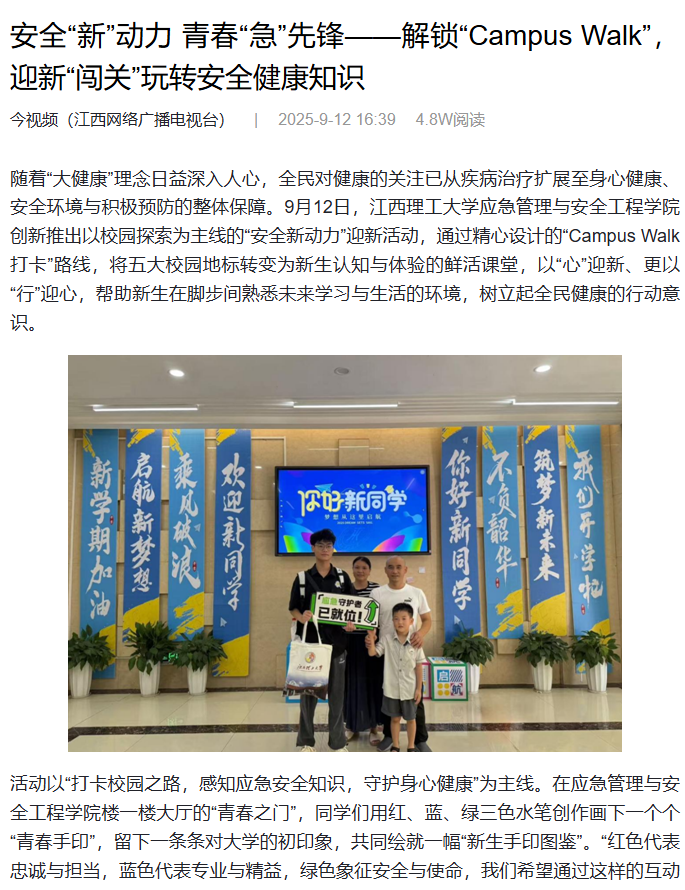 随着“大健康”理念日益深入人心,全民对健康的关注已从疾病治疗扩展至身心健康、安全环境与积极预防的整体保障。9月12日,江西理工大学应急管理与安全工程学院创新推出以校园探索为主线的“安全新动力”迎新活动,通过精心设计的“Campus Walk打卡”路线,将五大校园地标转变为新生认知与体验的鲜活课堂,以“心”迎新、更以“行”迎心,帮助新生在脚步间熟悉未来学习与生活的环境,树立起全民健康的行动意识。