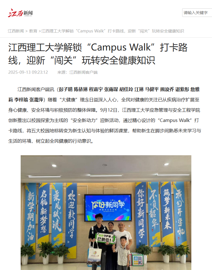 江西新闻客户端讯(彭子晴陈依琳程嘉宇张雨琛胡佳玲江琳马健平熊浚乔谌紫彤詹雅莉李梓瑜张霭萍)随着“大健康”理念日益深入人心,全民对健康的关注已从疾病治疗扩展至身心健康、安全环境与积极预防的整体保障。9月12日,江西理工大学应急管理与安全工程学院创新推出以校园探索为主线的“安全新动力”迎新活动,通过精心设计的“Campus Walk”打卡路线,将五大校园地标转变为新生认知与体验的鲜活课堂,帮助新生在脚步间熟悉未来学习与生活的环境,树立起全民健康的行动意识。