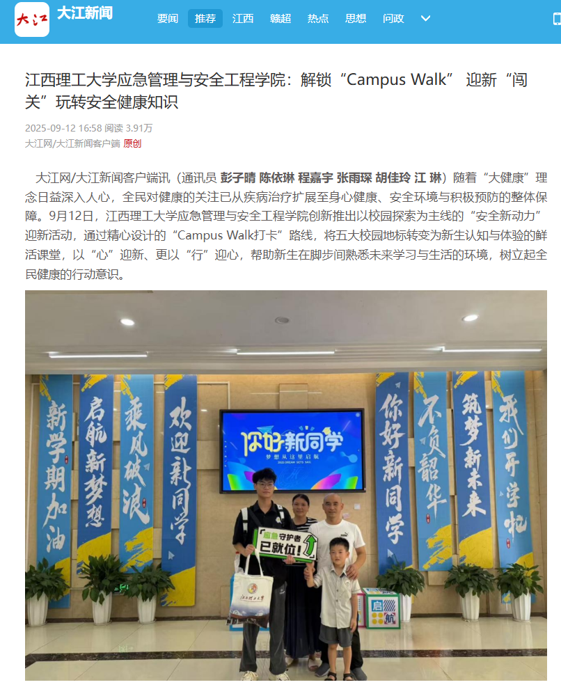 大江网/大江新闻客户端讯(通讯员彭子晴 陈依琳 程嘉宇 张雨琛 胡佳玲 江 琳)随着“大健康”理念日益深入人心,全民对健康的关注已从疾病治疗扩展至身心健康、安全环境与积极预防的整体保障。9月12日,江西理工大学应急管理与安全工程学院创新推出以校园探索为主线的“安全新动力”迎新活动,通过精心设计的“Campus Walk打卡”路线,将五大校园地标转变为新生认知与体验的鲜活课堂,以“心”迎新、更以“行”迎心,帮助新生在脚步间熟悉未来学习与生活的环境,树立起全民健康的行动意识。